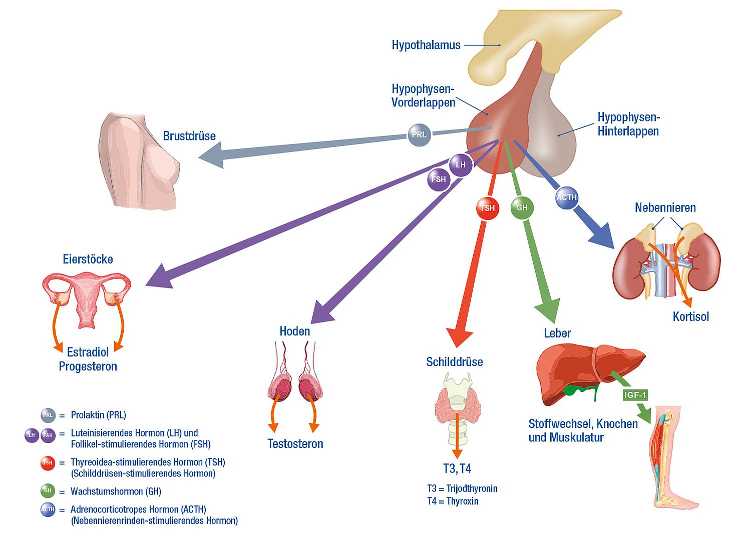 Die von der Hypophyse ausgeschütteten Hormone steuern die Schilddrüsenfunktion und die Funktion der Nebennieren. Hypophysenhormone regeln auch Wachstum, Entwicklung und Funktion der Eierstöcke bei der Frau und der Hoden beim Mann.