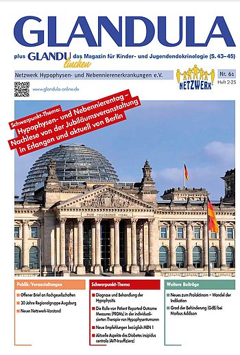 Der Schwerpunkt besteht aus Berichten vom diesjährigen Überregionalen Hypophysen- und Nebennierentag in Berlin sowie einer Nachlese der Jubiläumsveranstaltung in Erlangen. Es erwarten Sie eine Vielzahl interessanter Fachberichte, unter anderem über Hypophysitis, neue Empfehlung zu MEN (Multiple Endokrine Neoplasie), aktuelle Aspekte des Diabetes insipidus und Patient Reported Outcome Measures (PROMs) in der Therapie von Hypophysentumoren.