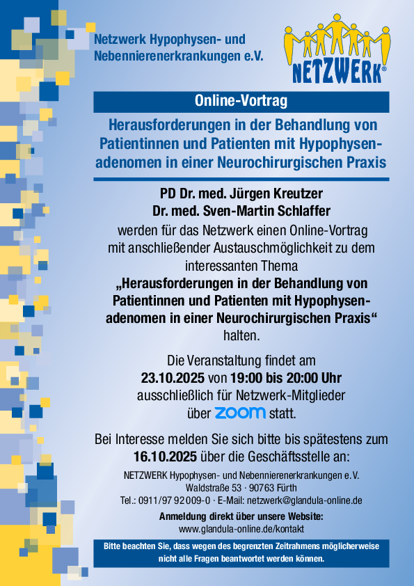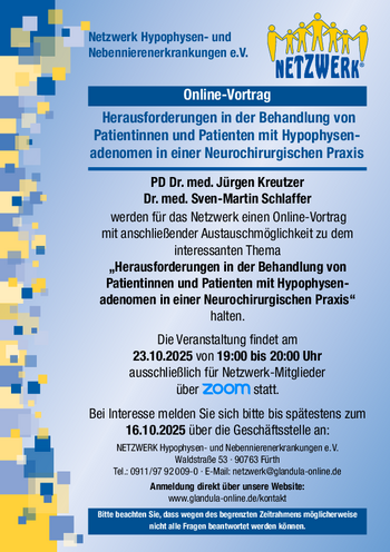 Am 23.10. werden PD Dr. med. Jürgen Kreutzer und Dr. med. Sven-Martin Schlaffer über "Herausforderungen in der Behandlung von Patientinnen und Patienten mit Hypophysenadenomen in einer Neurochirurgischen Praxis" referieren. Der Vortrag mit anschließender Austauschmöglichkeit findet ausschließlich für Netzwerk-Mitglieder von 19:00 bis 20:00 Uhr über Zoom statt.